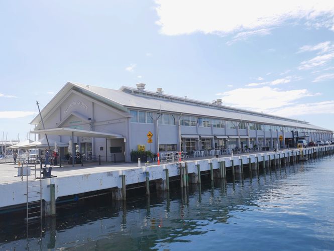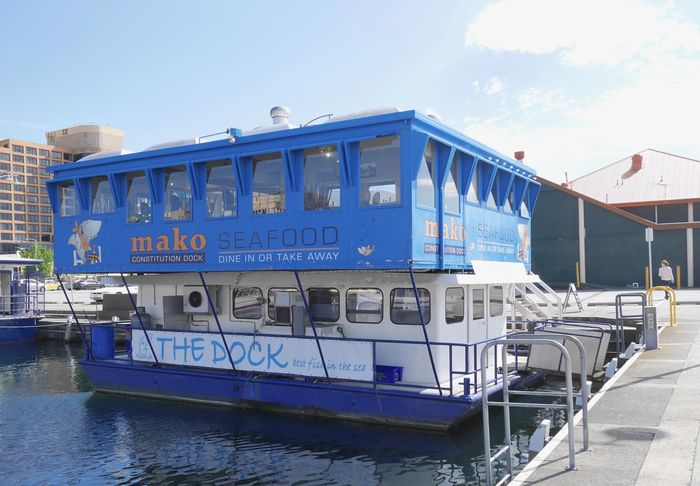 En face du Parlement, se trouve le port de Hobart, lieu stratégique de la cité. De là partent les bateaux de croisière et de pêche, chacun ayant son point d'attache. Je distingue la jetée Brooke Street qui consiste en un gigantesque bâtiment d'architecture moderne monté sur caissons flottants. Un peu plus loin, se trouve la jetée Elizabeth Street (ci-dessous) avec ses cafés, boutiques et restaurants. Non loin de là, j'observe le Constitution Dock, où mouillent quelques restaurants flottants bon marché (deuxième photo), des fish & ships pour la plupart. Le restaurant Mures Lower Deck se dresse quant à lui sur le quai Victoria, face aux bateaux de pêche. Le premier quai des pêcheurs verra le jour dans les années 1840 et demeurera le point d'ancrage de la profession. Jadis, on y mettait les filets à sécher dehors, et le poisson était vendu à même le sol, à bord des bateaux ou dans des brouettes. Un marché au poisson sera bien construit en 1856 mais fermera quelques années plus tard suite à la désaffection des pêcheurs trop attachés à leurs traditions. Au plus fort de l'activité, on dénombrait ici plus de cent navires de pêche. Le port connaîtra aussi sur une courte période l'existence des fumoirs à poisson qui empesteront l'air alentour et disparaitront bientôt, laissant la place aux premières unités de congélation, dont les produits étaient revendus aux bateaux de croisière et aux bâtiments militaires.