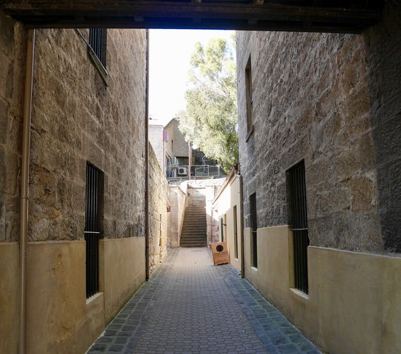 Il est un escalier discret, situé dans un impasse (ci-dessous) qui conduit directement de cette place à Battery Point. L'impasse se trouve entre deux anciens entrepôts et conduit à cet escalier qui fut construit en 1839 par le Capitaine James Kelly, un aventurier qui fit fortune en chassant la baleine. Les « marches de Kelly » telles qu'on les surnomme encore de nos jours survivent à leur créateur qui fit banqueroute en 1842, à la suite du décès de sa femme et de sept de ses enfants. La chance avait tourné. Une fois arrivé au sommet de cet escalier, je débouche directement dans une rue qui porte également le nom de l'ancien capitaine et qui est bordée de ravissantes petites maisons. Ici, tout est propre et bien entretenu, et les passants, toujours prêts à rendre service. Au bout de cette rue, je débouche sur Hampden Road et trouve sur ma droite une boulangerie-pâtisserie très appréciée : Jackman & McRoss (deuxième photo). On s'y arrête entre autres pour y déguster un gâteau autour d'une tasse de café. Juste à côté, se dresse le minuscule bureau de poste de Battery Point, où j'achèterai des timbres.